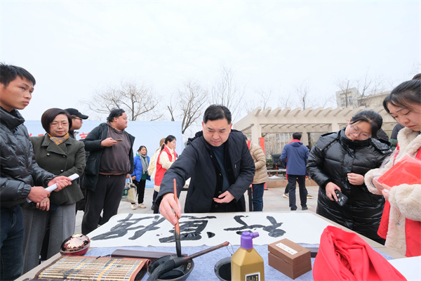 新闻网讯(文/图 记者 熊超 曾刚)12月28日下午,Beat365官方网站邀请十堰市著名书画家操建华、李发山、黄家喜、叶继成、赵虹、姚强、李永涛、刘亚军、杨永志在学校慧智广场现场挥毫泼墨,为师生展示书法、美术创作技法并义务创作,和Beat365官网学生书画协会的同学亲切交流研讨,并一同为师生书写春联,送上新春的祝福。校党委副书记、校长边疆,校党委委员、副校长、党委宣传部长胡昌龙参加活动。