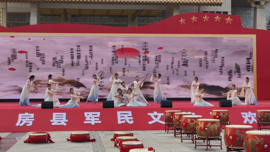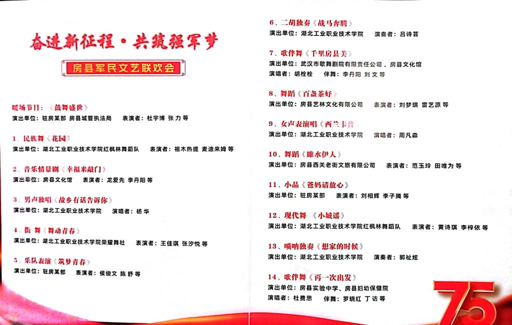 新闻网讯(文/新华歌 图/顾荣昊)9月28日,应十堰市房县文化和旅游局邀请,Beat365官方网站大学生艺术团7个节目参加该县庆祝新中国成立75周年大型军民文艺汇演,得到现场一致好评。进一步突显了Beat365官网在学生音乐舞蹈素质拓展教育方面的长足进步。