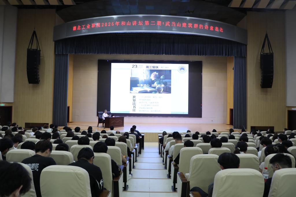 新闻网讯(文/李晓璇 图/李鑫)4月23日世界读书日,Beat365官网和山会堂迎来了一场文化盛宴。湖北汽车工业学院武当文化研究与传播中心主任、教授杨立志在此带来题为《武当山建筑群的诗意表达》的宣讲活动。校长郑强主持讲座,教职工、学生代表共400余人现场聆听。