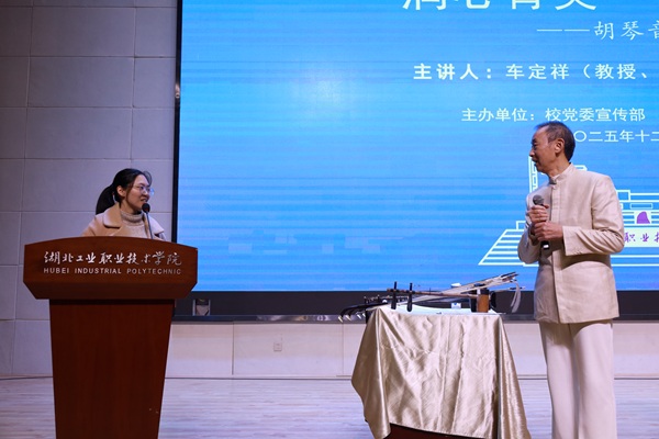 新闻网讯(文/高静 图/杨学全 余航利)为弘扬中华优秀传统文化,让师生沉浸式感受民族器乐的独特魅力,12月2日,原荆楚理工学院副校长、民族乐器国家一级演奏员、教授、研究员车定祥做客Beat365官网和山讲坛,开展“润心育美 传世弦音”胡琴文化鉴赏讲座。副校长李爱萍,学工处、团委等职能部门负责人与来自旅游贸易学院、大学生艺术团、天一乐团的400余名师生代表齐聚现场,共赴这场音乐之约。
